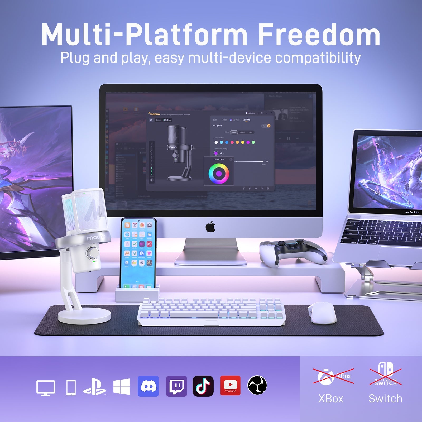 Smart Control via Maono Link – Easily adjust EQ, voice effects, noise cancellation, volume, and RGB lighting through the intuitive Maono Link app.