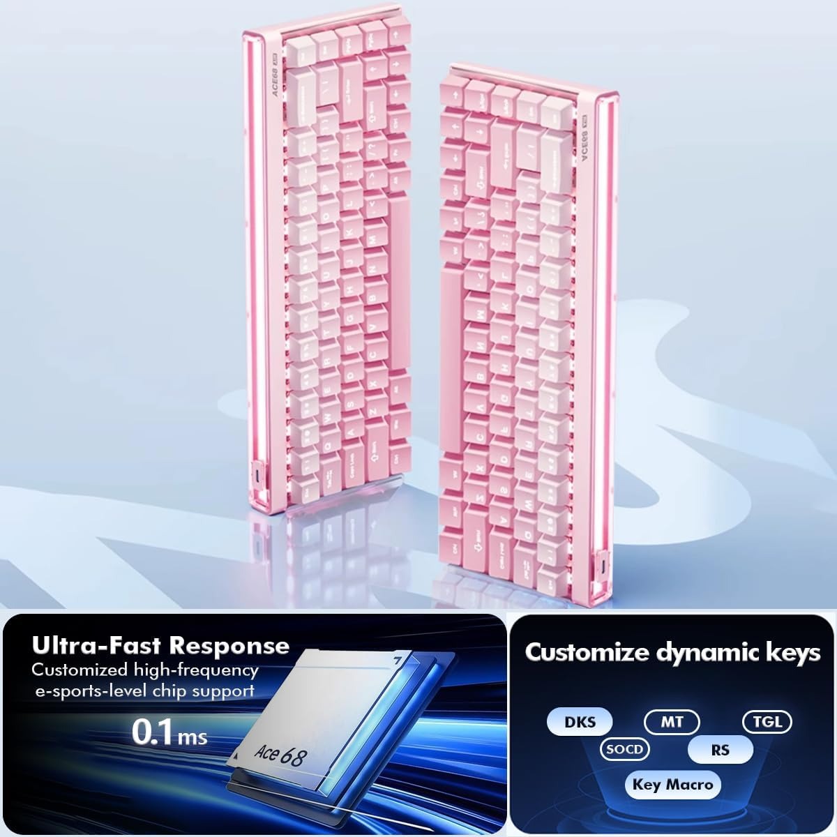 Ace 68 Air delivers a true 8000Hz polling rate and a 128K scan rate, achieving ultra-low latency — as low as 0.08ms on select models. Powered by our custom high-frequency, esports-grade chip, every press is faster and more precise, delivering a smoother, more responsive gaming experience — essential for fast-paced games where every millisecond counts.