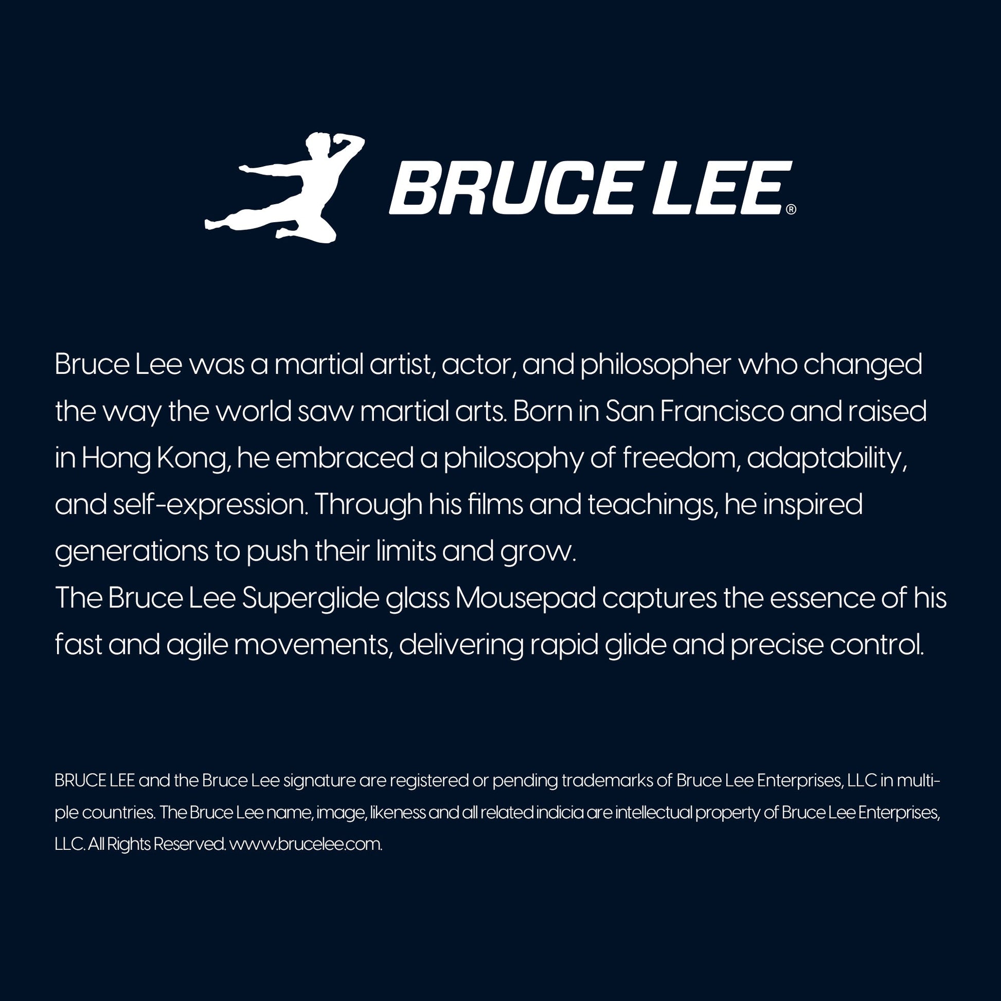 BRUCE LEE and the Bruce Lee signature are registered or pending trademarks of Bruce Lee Enterprises, LLC in multiple countries. The Bruce Lee name, image, likeness and all related indicia are intellectual property of Bruce Lee Enterprises, LLC. All Rights Reserved. www.brucelee.com.