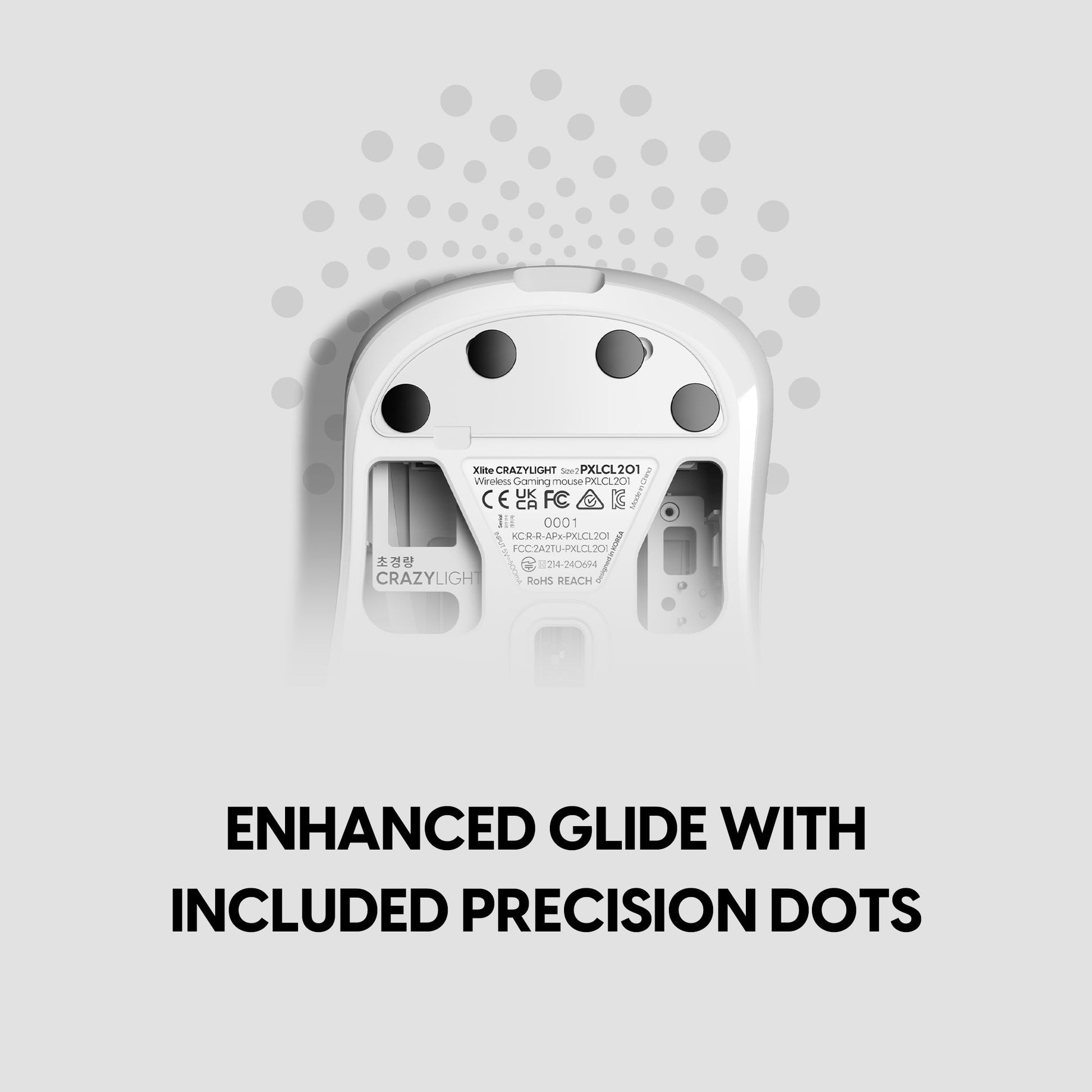 A total of 16 UHMW-PE 6.6mm Mouse Dot Skates are included. When attached to the mouse and used on a glass pad, they produce minimal noise and offer excellent wear resistance, allowing smooth performance even with extended use. The level of control through friction can be adjusted based on the number of dots applied.